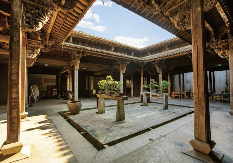 这里以木雕闻名,被誉为“木雕艺术的殿堂”。建筑采用梁架结构,多以抬梁穿斗混合式,用材精挑细选,工艺上乘。硬山顶屋面,小青瓦阴阳合铺,四周环以高大的封火山墙,谱写出宏伟壮丽的建筑歌谣。